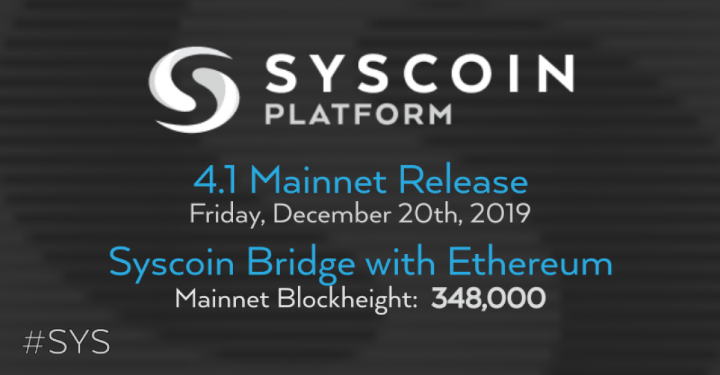 Syscoin Bridge, to and from Ethereum, will go live at block number 348,000, expected approximately January 28th, 2020, giving miners, exchanges and masternode operators an ample window of time to update accordingly.