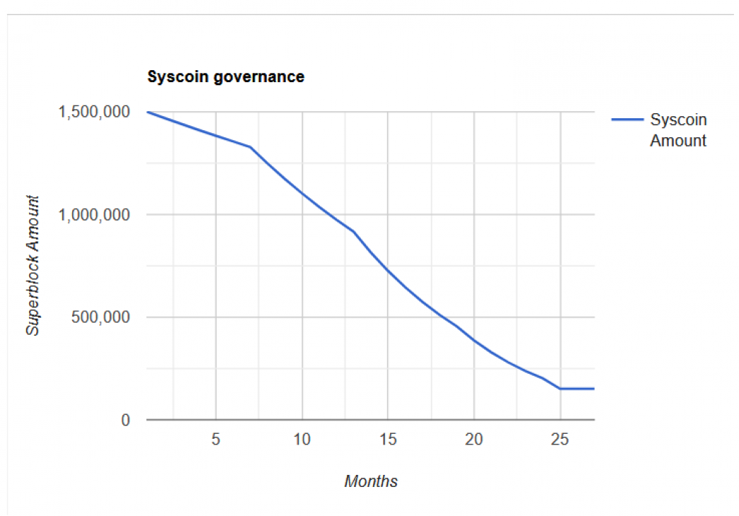 Since we strongly believe that the Syscoin price will grow going forward, we have implemented a % decline schedule — starting the first month with 1 500 000 SYS and ending on the 24th month with 196.708 SYS. After that period, the superblock starts with 151 767 SYS a month and will decline 5% every year.