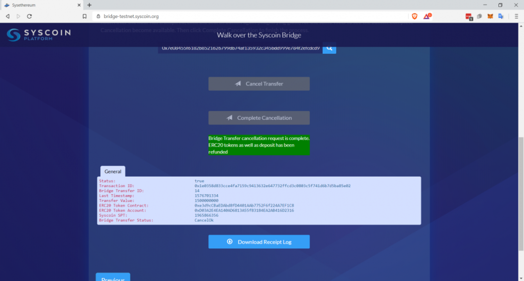 Because Syscoin is also an Ethereum node validating roughly the last week of blocks for scalability purposes, there is an inherent security versus convenience tradeoff. This means users burning tokens on Ethereum to cross the bridge to Syscoin have roughly one week to complete the process. In some situations users may forget or for other reasons mistakenly not complete the transfer. With the newly added feature it is now possible to cancel the transaction and get your ERC-20 back.